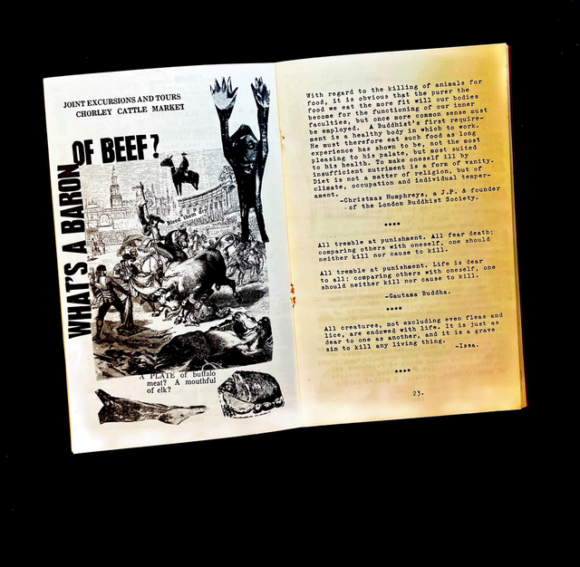 early veganism/animal rights pamphlet produced by dave cunliffe and tina morris through their BB Bks imprint, feat essays poetry and collage. incredible